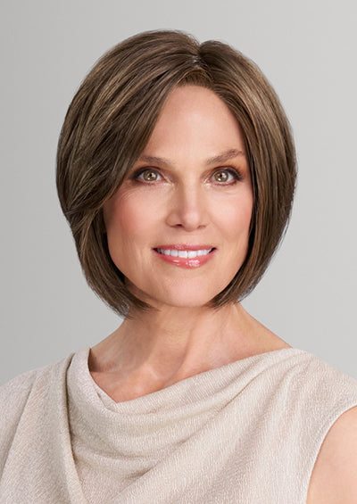AVA [Full Wig | Extended Lace Front | Single Monofilament Top | Hand-Tied Back | Premium Synthetic] The light-density design and extended SmartLace™ lace front that runs from ear tab to ear tab give Ava an exceptionally natural look. This sleek bob features a polished silhouette and timeless appeal, making it a sophisticated, easy-to-maintain choice. A monofilament top and fully hand-tied cap provide maximum comfort, a realistic scalp appearance, and multi-directional parting. Structured and refined, Ava embodies classic elegance at its best.