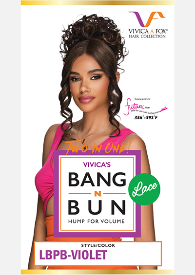 LBPB-VIOLET [Lace Part with Bang N Bun | Futura Fiber Synthetic] is a Pin Curl with an 11-inch long Curly Lace Part Bang Bun.